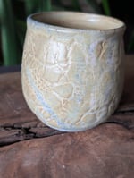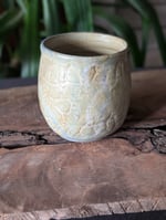 Handmade ceramic mug pressed with handmade lace to create an interesting design